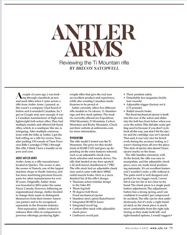 A couple of years ago, I was looking through classifieds at new and used rifles when I came across a rifle from Antler Arms. I paused, as this wasn’t a company I had heard of before and it sounded Canadian. So, I got on Google and, sure enough, it was a Canadian manufacturer of high-end, lightweight bolt-action rifles. They had multiple models and offered left-hand rifles, which, to a southpaw like me, is intriguing. After multiple conversations with the folks at Antler, I got the ball rolling on a rifle for review. Now, after putting 139 rounds of 7mm Precision Rifle Cartridge (7 PRC) through this rifle, I think I have a handle on its pros and cons.